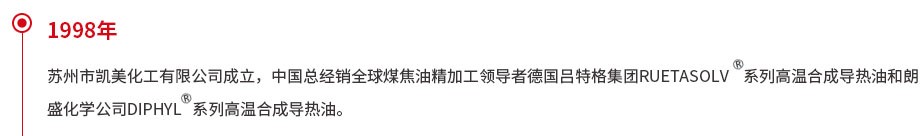凯美公司是中国专业化、系统化市场推广高温合成导热油及其加热系统设计行业应用的先行者。公司将享誉全球的德国高品质高温合成导热油引入中国,并陆续成功研发、生产出中国的全系列高性价比特殊用途气相合成热媒系列产品和低温、超低温合成冷媒&热媒产品,在倡导导热油科学选型、优化甚至改变导热油及其加热系统行业应用和取代国外价格昂贵同类导热油产品国产化等方面业绩显著,同时配备实践经验丰富的化学工程、导热油及其加热系统传热和应用工程师组成的技术支持专业团队,并与行业、产业链上下游合作伙伴建立起紧密合作的长期战略伙伴关系,建立健全了行之有效的覆盖全国的营销网络。